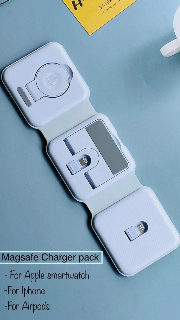 The MagSafe Trio Charger charges your compatible iPhone, Apple Watch, Charging Case for AirPods, and other Qi-certified devices quickly and easily. Simply place your devices on the charger, and a steady, efficient charge begins as soon as they make contact. The charger folds neatly so that you can easily carry it wherever you go.