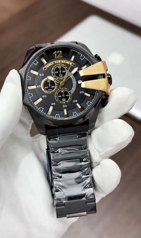 ✅ *Commanding and stylish, this New Diesel Mega Chief watch features a gold chronograph dial with an Only the Brave tag and metal bracelet.* ✅